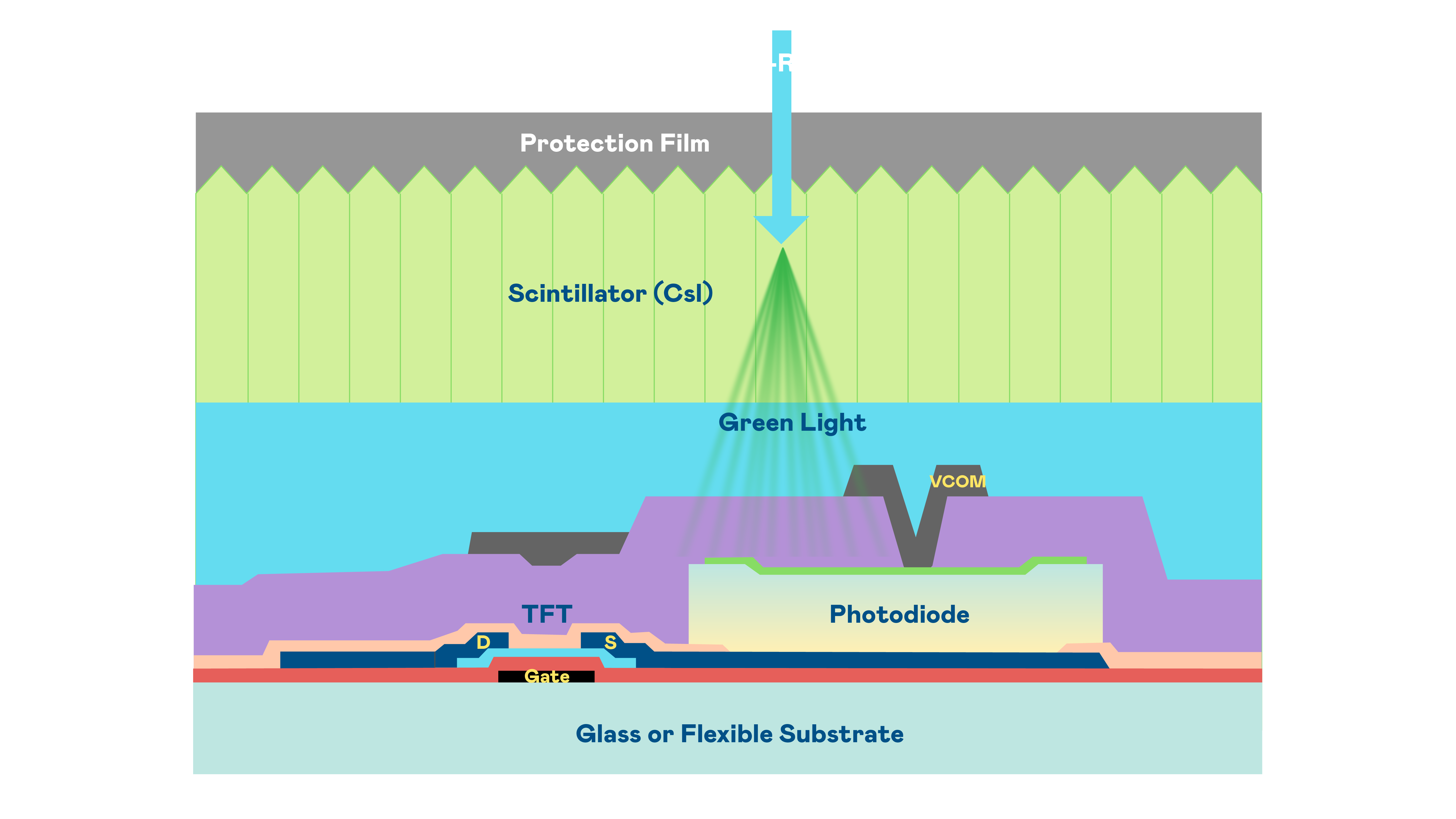 恒峰G22的X光影像感測陣列使用薄膜電晶體 (TFT) 作為每個像素的讀取開關,搭配光電二極體(Photodiode)的光電轉換元件,用以感測X光影像訊號。
